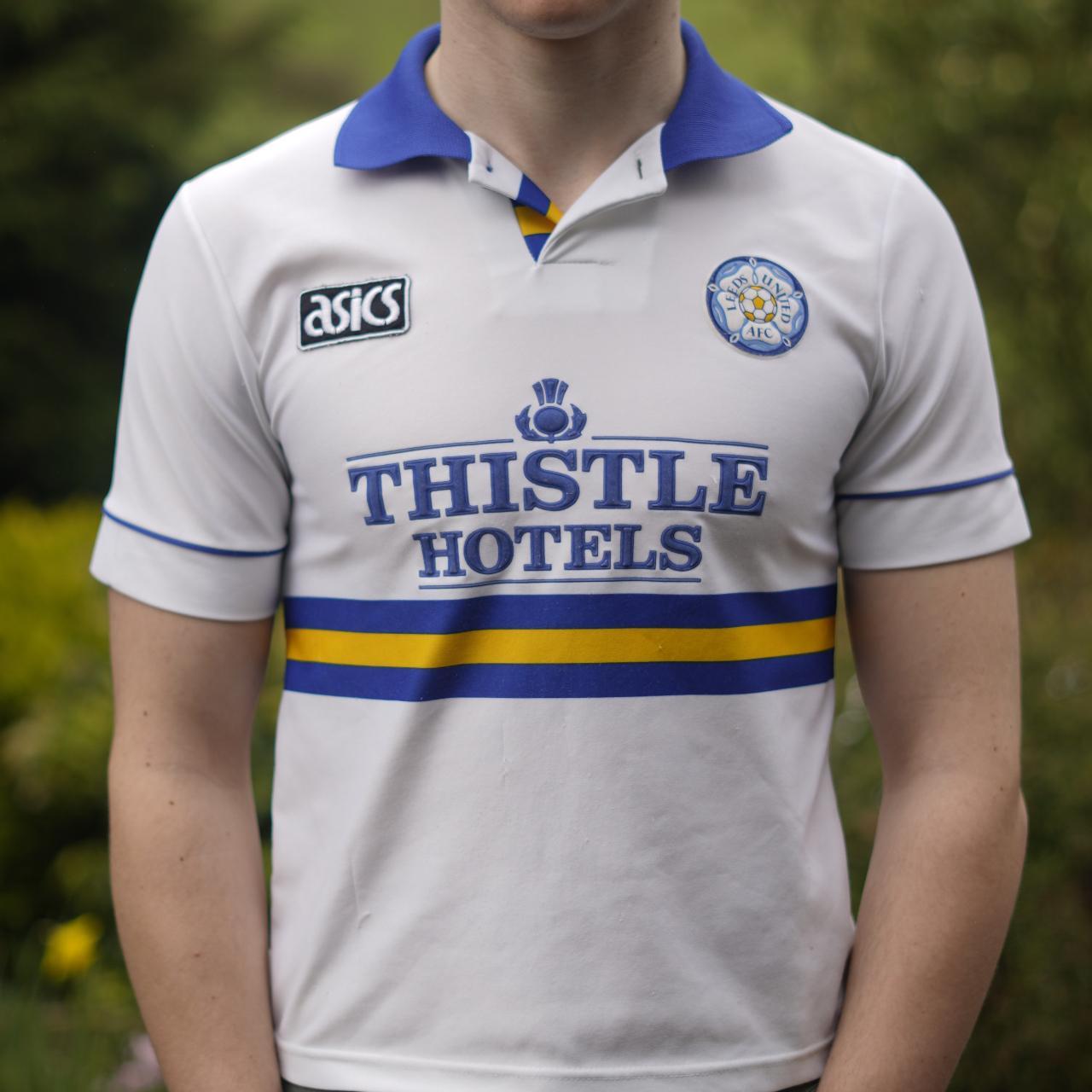 Vintage Leeds football shirt featuring classic flower badge and Thistle Hotels sponsor. Boys size but would fit an XS or smaller woman's size. Some signs of wear, great condition overall.
